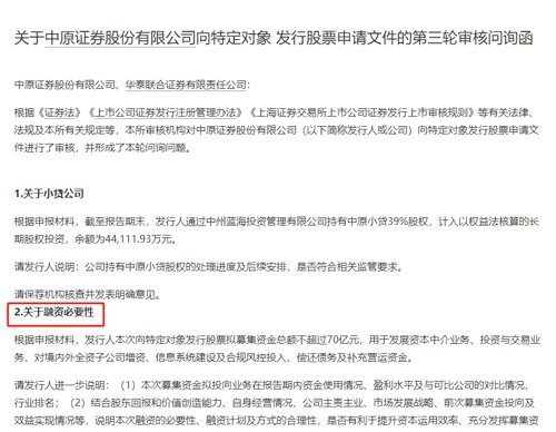7月6日,中原证券及本次定增的保荐券商华泰联合证券,收到关于本次定增融资的第三次审核问询,其中重点是关于融资的必要性。