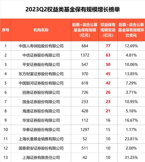 此外,在权益类基金保有量前100强中,平安证券、东方财富证券、银河证券、招商证券等多家券商保有规模逆势增长,在二季度权益基金规模增长榜单中位居前列,受到了市场的关注。