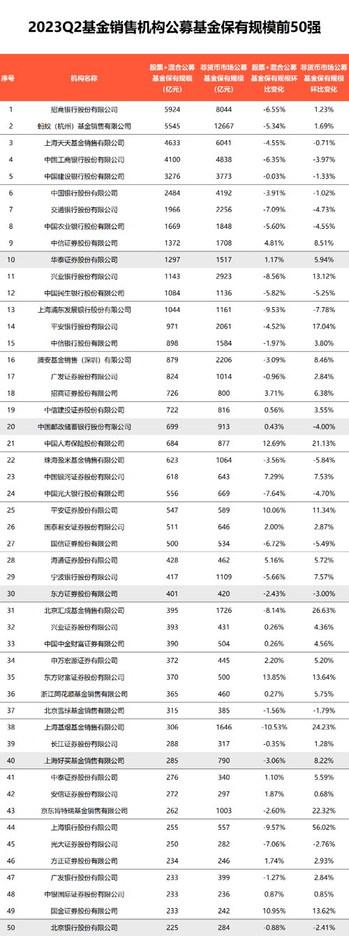 7月21日晚间,中基协公布今年二季度基金销售机构公募基金保有规模数据。