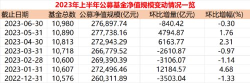 协会公示的数据显示,截至2023年6月30日,公募基金管理总净值规模为27.69万亿元,与上月相比,环比减少840.53亿元。