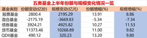 此外,受海外市场走强影响,QDII基金上半年份额规模均出现增长,其中份额增加490.12亿份,增幅13.20%,规模增加320.23亿元,增幅9.80%。