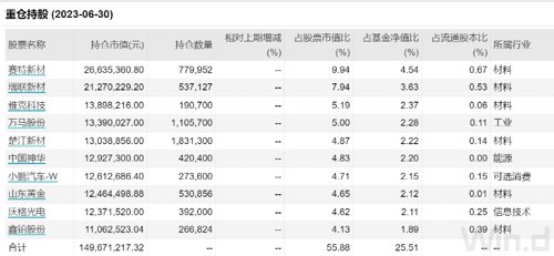 截止二季报,该基金股票仓位为45.66%。施成在二季报中表示,产品成立三月有余,期间一直保持较低仓位运行。主要源于:由于一季度来的强复苏预期在二季度走弱,周期板块(有色、化工、煤炭等)出现了无差别的大幅回调,控制仓位避免产品回撤较多;同时,持仓标的选择更多偏向于自下而上的一些品种,比如化工、有色里的新材料标的,此外对于中长期逻辑比较顺的铜铝、黄金、煤炭及一些化工龙头白马等仍然保持了一定仓位。