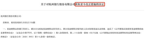 根据《销售办法》等规定,浙江证监局决定对杭州银行采取责令改正的行政监管措施,并记入证券期货市场诚信档案。