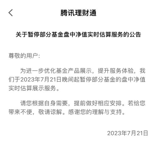 7月21日,腾讯理财通发布《关于暂停部分基金盘中净值实时估算服务的公告》,表示为进一步优化基金产品展示,提升服务体验,理财通将于7月21日晚间暂停部分基金的盘中净值实时估算展示服务。