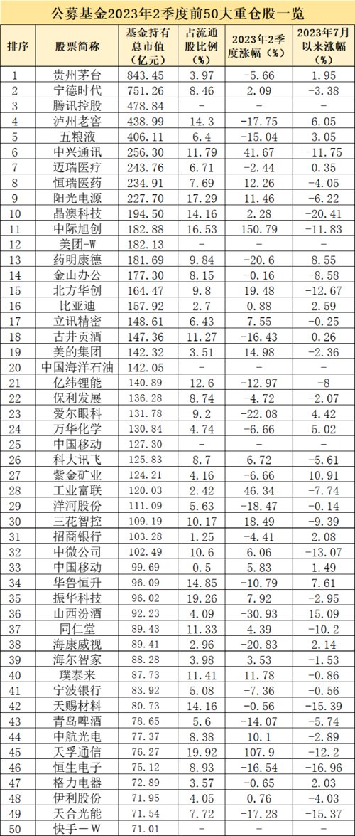 天相投顾数据显示,公募基金全部持仓中(含港股),贵州茅台、宁德时代、腾讯控股、泸州老窖、五粮液、中兴通讯、迈瑞医疗、恒瑞医药、阳光电源、晶澳科技位列前十大重仓股(统计口径为公布2023年二季报的4980只积极投资偏股型基金)。