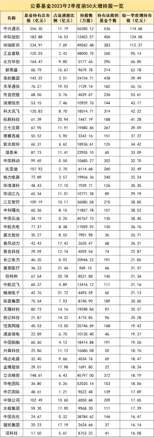从增减持情况来看,中兴通讯是被增持最多的个股,公募基金合计增持中兴通讯超174亿元,增持流通股比例8.14%。持有中兴通讯的基金数量也从一季度末的210只增加到536只。