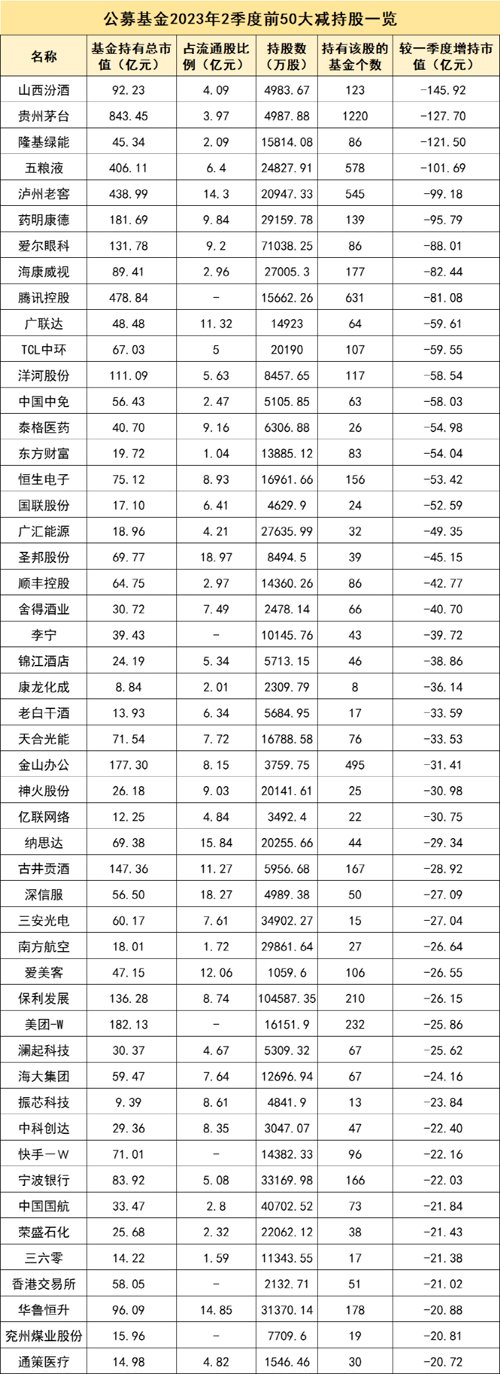 2023年二季度,贵州茅台、宁德时代、腾讯控股、泸州老窖、五粮液依然位列公募基金前五大重仓股。