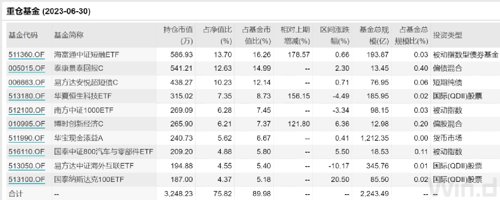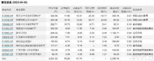 具体来看,长城恒泰养老2040三年由蔡旻管理,截至二季度末,这只FOF的基金仓位为83.16 %,较一季度末下降了1个百分点;债券的持仓占比为5.19%, 较一季度略有下降。从资产配置情况来看,这只FOF二季度重仓了多只ETF产品,既有细分赛道ETF、短融ETF、也有指数型债券基金,此外,还重仓了易方达中证海外互联ETF、国泰纳斯达克100ETF两只QDII股票基金,分别位列第一、第二大重仓基金。