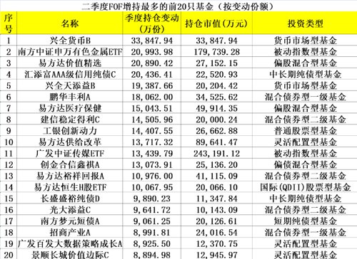 相比之下,增持基金更能反映出FOF基金对未来市场的看法。Wind数据显示,从季度持仓变动数据来看,二季度被FOF增持最多的10只基金为:兴全货币B、南方中证申万有色金属ETF、易方达价值精选、汇添富AAA级信用纯债C、兴全天添益B、鹏华丰利A、易方达医疗保健、建信稳定得利C、工银创新动力、易方达供给改革。