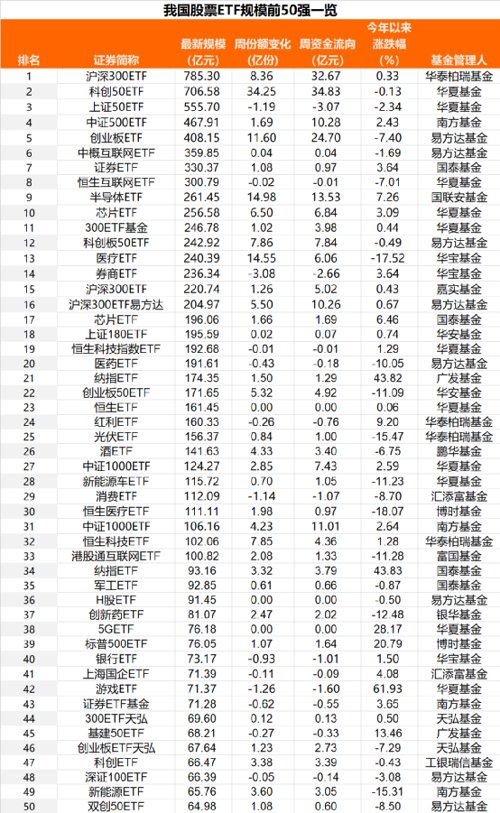目前的市场格局中,华泰柏瑞沪深300ETF规模785.30亿元,高居股票ETF规模首位,华夏科创50ETF同样晋级700亿阵营,上证50ETF同期规模超500亿元。此外,南方中证500ETF、易方达创业板ETF则位居400亿之列。而在行业和主题ETF中,已经诞生中概互联网ETF、证券ETF、恒生互联网ETF超300亿体量的基金。