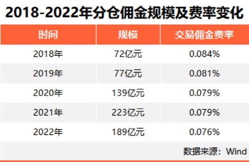 复盘来看,在机构交易佣金率近年来稳中有降的情况下,分仓佣金总规模随着公募基金规模特别是权益类产品规模同步发展壮大。Wind数据显示,券商分仓佣金在2020年总规模突破百亿,在2021年达到223亿元的高峰期。