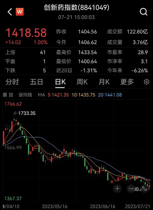 从WIND创新药指数(8841049)来看,从4月14日至今,在触及1733.35的年内高点之后,该指数就掉头持续下跌,至7月21日收盘,三个月跌幅达19%,目前还未看到止跌迹象。
