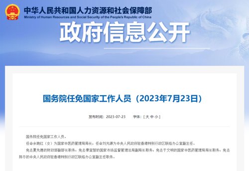 据人社部官网7月23日消息,国务院任免国家工作人员。