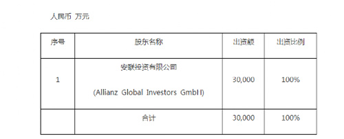 安联基金注册资本为3亿元人民币,安联投资有限公司出资比例为100%。