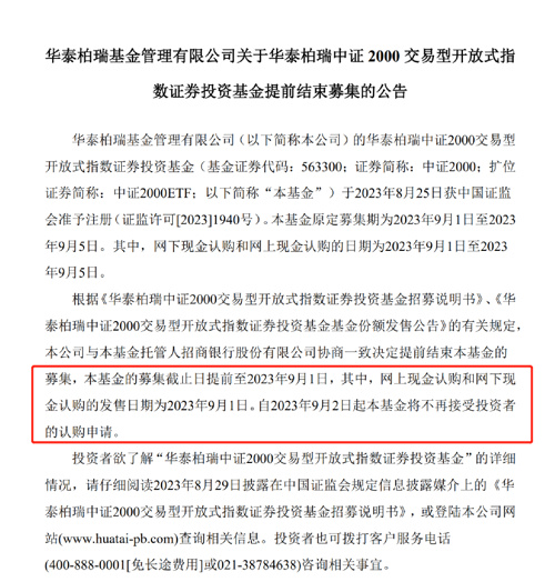 而就在当日收盘后,华泰柏瑞基金率先发布了关于华泰柏瑞中证2000ETF提前结束募集的公告。公告宣布,该基金原定募集期为9月1日至9月5日,根据相关规定,将募集截止日提前至2023年9月1日。