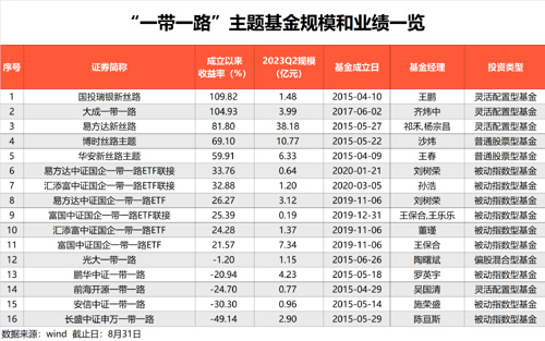 WIND数据显示,截至2023年9月1日,目前“一带一路”主题基金共计16只,易方达、富国、博时、华安、汇添富等头部基金公司均参与其中。