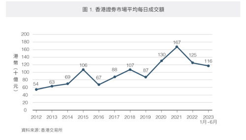 香港金发局8月31日在题为《提升市场流动性和多样性,强化香港作为国际集资中心的竞争力》的报告中指出,尽管在过去十年间交易量持续上升,但在今年前六个月,香港交易所的平均每日成交额只有1160亿港元,较 2022年同期下跌约7.5%。2022年的日均成交额为1250亿港元,2021年的日均成交额则为1670亿港元。