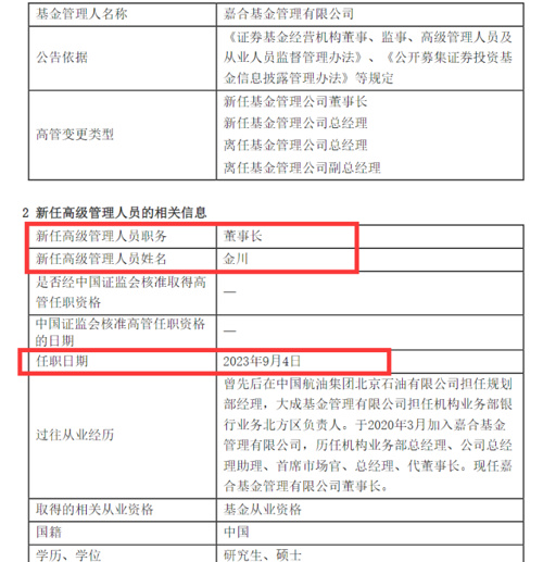 根据公告,9月4日起,公司总经理金川新任董事长。今年3月6日,嘉合基金原董事长周健男因个人原因离任,时任公司总经理的金川于同日起代任董事长一职。此次公告发布,标志着金川正式结束代任,升任董事长职位。