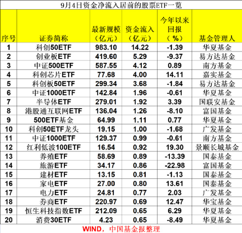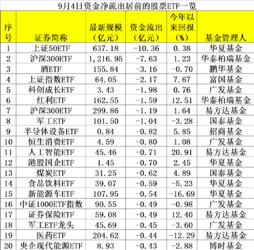从资金净流出排行看,9月4日,从资金净流出榜单看,有9只股票ETF当日资金净流出超过1亿元,有5只宽基类ETF,3只为行业主题ETF。
