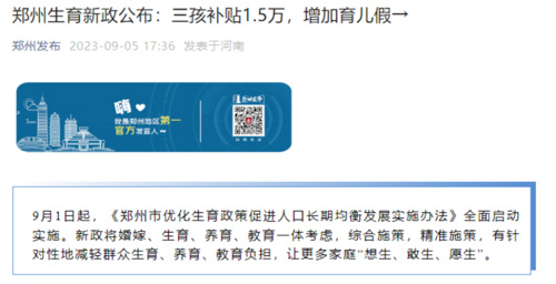 9月5日,“郑州发布”消息显示,9月1日起,《郑州市优化生育政策促进人口长期均衡发展实施办法》全面启动实施。政策规定,对新生儿入户郑州市的一孩、二孩、三孩及以上家庭分别一次性发放2000元、5000元、15000元的育儿补贴。