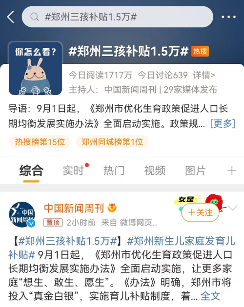 消息发布后,#郑州三孩补贴1.5万#的词条迅速登上微博热搜,并成为郑州同城榜热度第一位。不少网友留言称“生晚了”、“开生”,并期待政策落地。