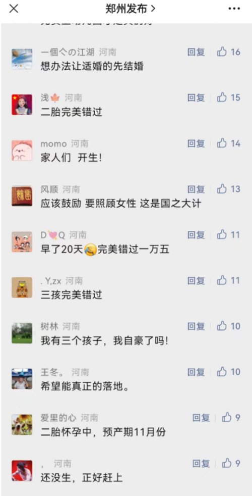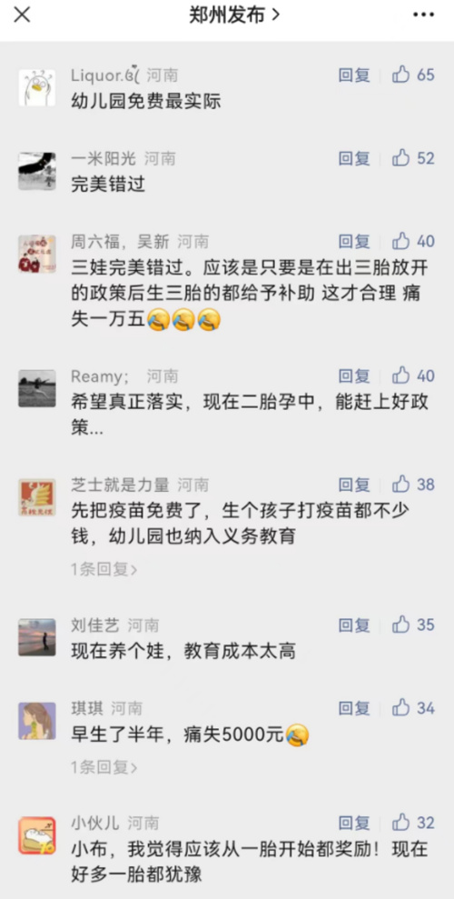 对于郑州推出的新政策,不少网友留言点赞,期待政策落地。也有网友抱怨“生早了”,并希望政策能够溯及既往,覆盖三胎放开后即生三胎的人群。