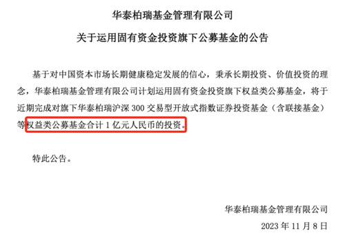 11月8日,华泰柏瑞基金公告称,基于对中国资本市场长期健康稳定发展的信心,秉承长期投资、价值投资的理念,华泰柏瑞基金将于近期运用固有资金自购旗下华泰柏瑞沪深300ETF(含联接基金)等权益类公募基金,合计1亿元。
