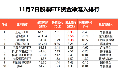 具体从资金流向看,在昨日震荡行情中,上证50ETF净流入最多,达到6.33亿元;创业板ETF、深红利ETF、沪深300ETF等都有3个亿以上的资金流入。