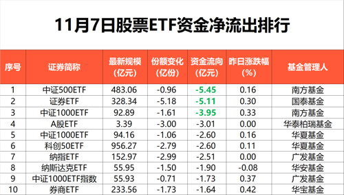 资金流出方向看,中证500ETF仍然位居全市场首位,单日净流出超5个亿,宽基指数中,中证1000ETF也是资金净流出的主要方向,南方、华夏、广发基金旗下中证1000ETF共计净流出超8亿元。