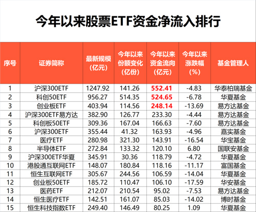 拉长时间来看,今年以来已有超4600亿元借道股票ETF(统计股票ETF和跨境ETF)进入股市,四只沪深300ETF龙头产品就大买超过1000亿元,科创50、创业板相关指数等也是资金净买入的主方向。