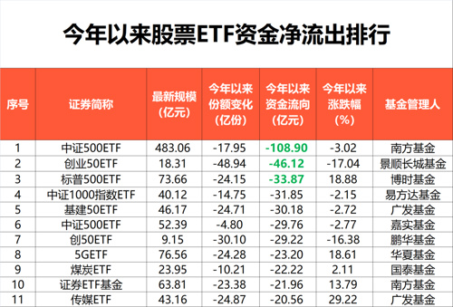 净流出方向中,中证500ETF是今年唯一一只净流出超百亿的宽基ETF产品,创业50ETF、标普500ETF、中证1000指数ETF等都有超30亿元的净流出。