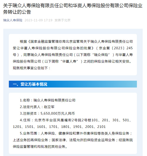 11月9日,国家金融监管总局披露的批复信息显示,瑞众人寿保险有限责任公司(以下简称瑞众保险)已获批受让华夏人寿保险股份有限公司(以下简称“华夏人寿”)的保险业务及相应的资产、负债。
