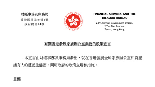 2023年3月24日,香港特别行政区政府发布了“有关香港发展家族办公室业务的政策宣言”,以吸引全球家族办公室将其财富带到香港。香港财政司司长陈茂波曾指出,家族办公室业务的蓬勃发展,将有利香港汇聚全球各地资金、壮大香港的金融市场以及资产和财富管理业,并推动金融和专业服务、创科、绿色以及文化艺术以至慈善事业的持续发展,增强香港的发展动能。