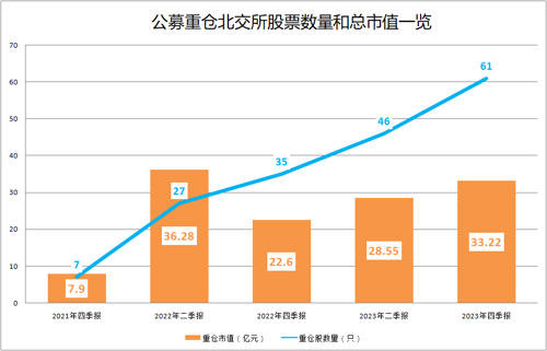 公募基金2023四季报显示,截至2023年末,公募重仓北交所股票数量已达61只,创历年新高;重仓持股总市值33.22亿元,同比激增47%,位居历史第二高。