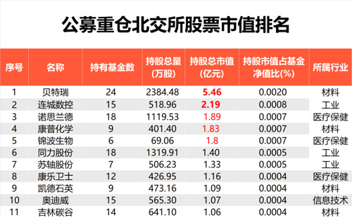 从基金重仓股方向看,材料、医疗保健、工业等行业龙头股是主要投向,贝特瑞最受公募基金青睐,共有24只公募基金持股总市值达到5.46亿元。连城数控、诺思兰德等公募重仓市值也超1.8亿元以上。