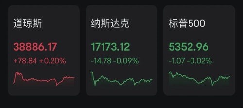 截至收盘,道指涨0.2%,报38886.17点;标普500指数跌0.02%,报5352.96点;纳指跌0.09%,报17173.12点。