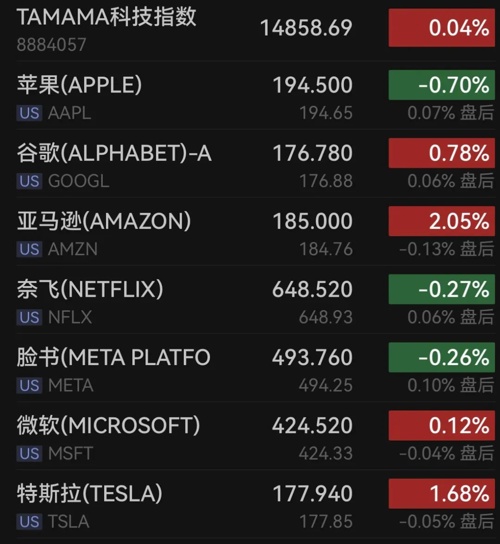 科技股涨跌不一,万得美国TAMAMA科技指数涨0.04%,苹果跌0.7%,亚马逊涨2.05%,奈飞跌0.27%,谷歌涨0.78%,脸书跌0.26%,微软涨0.12%,特斯拉涨1.68%。