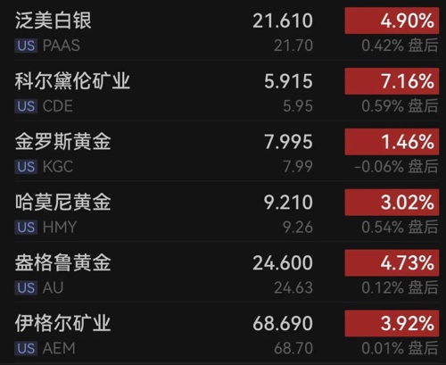 “金银铜”齐涨,白银涨超4%,黄金股多数上涨。