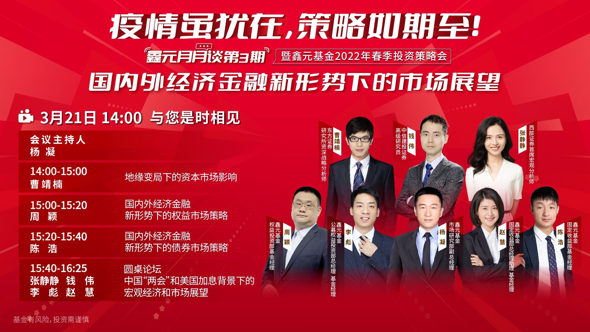 会议议程:14:00-14:05主持人:杨凝鑫元基金市场研究部副总经理14:05-15:00地缘变局下的资本市场影响曹靖楠东方证券研究所资深战略分析师15:00-15:20国内外经济金融新形势下的权益市场策略周颖鑫元基金权益投资部基金经理15:20-15:40国内外经济金融新形势下的债券市场策略陈浩鑫元基金固定收益部基金经理15:40-16:25圆桌论坛:中国“两会”和美国加息背景下的宏观经济和市场展望张静静西部证券首席宏观分析师钱伟中信建投证券高级研究员李彪鑫元基金公募权益投资部总经理基金经理赵慧鑫元基金固定收益部总经理助理基金经理(基金投资有风险,请谨慎投资。本栏目嘉宾观点不代表中国基金报观点,不构成任何投资建议。)