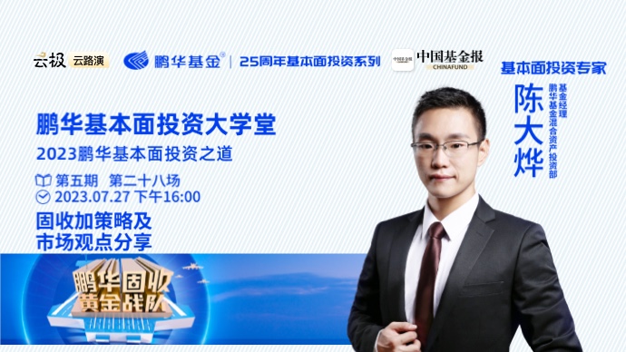 “鹏华基金基本面投资大学堂”秉承价值投资的理念与初心,本着归本溯源的基本投资规律,为各位投资者呈现精彩的投资盛宴。今天特别邀请到鹏华基金混合资产投资部的基金经理陈大烨总莅临直播间,为大家带来基本面投资大学堂第五期第28讲!今天的主题是“固收加策略及市场观点分享”。