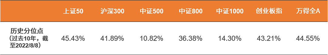 随着市场从6月底的相对高点逐步回落,主要市场指数估值的历史分位点进一步下调,均已跌破历史中位数以下。