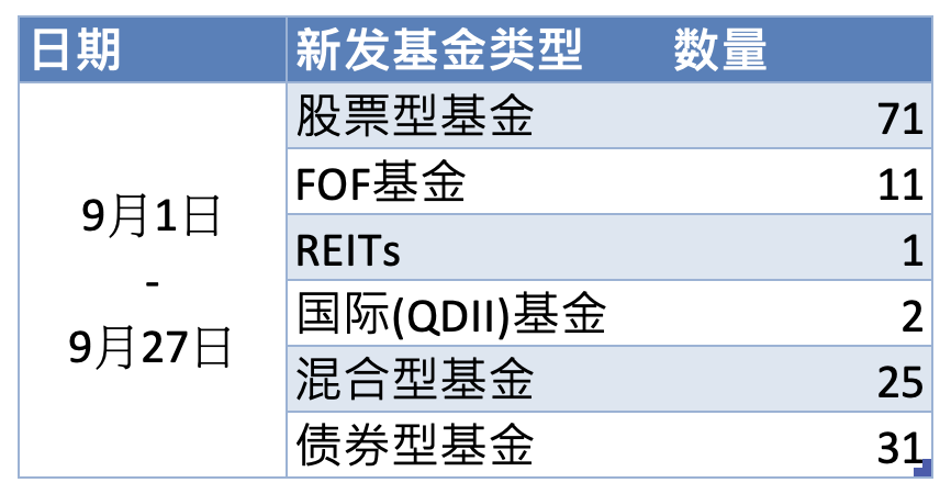 根据Wind数据,9月1日至27日,共计有147只新基金成立并在本月内发行,发行份额合计1070.85亿份,平均发行份额9.82亿份,为今年新高。