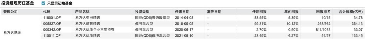 其中,易方达蓝筹精选规模增长超14亿元,至364.13亿元;易方达优质精选最新规模为133.45亿元,单季度增加5亿元以上,易方达优质企业三年持有规模缩水近6亿元。此外,易方达亚洲精选规模微增。