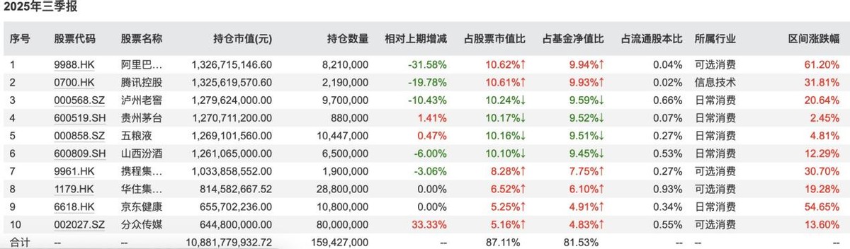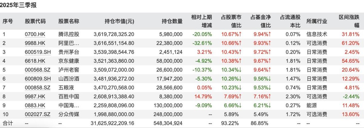 易方达优质精选三季度大幅增持分众传媒,加仓幅度超过30%,阿里巴巴-W、腾讯控股、泸州老窖减仓幅度均超10%,阿里巴巴-W更是超过30%。